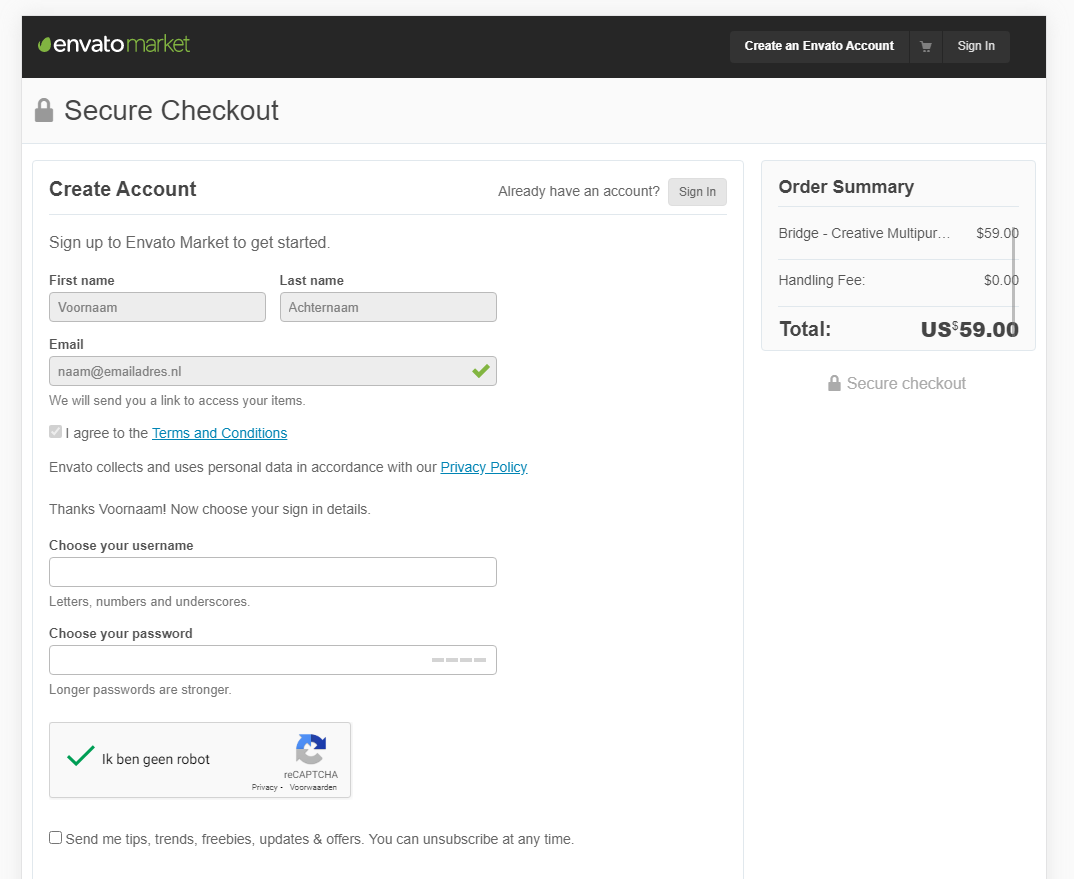 Het 2e deel van de registratie bij Themeforest (Envato Market) is het kiezen van een gebruikersnaam + wachtwoord en het bewijzen dat je geen webbot / robot bent (de bekende Captcha beveiliging waar je soms ook zebra paden en verkeerslichten moet zoeken in een foto). Optioneel kun je jezelf aanmelden voor de Envato nieuwsbrief bij “send me tips… etc.”.