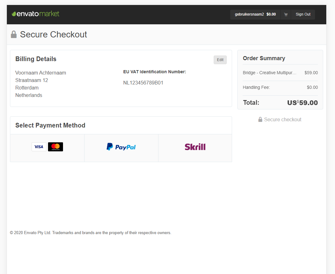 Het laatste scherm biedt de mogelijkheid om voor de template te gaan betalen. Ben je een zakelijke klant dan moet je hier even goed opletten! Je ziet op onderstaand scherm dat er bovenop de oorspronkelijke aanschafwaarde (in dit geval 59.00 dollar) een bedrag van 12.39 dollar is geplaatst vanwege VAT (BTW). Ben je een ondernemer / bedrijf dan kun je deze theme ook zonder VAT (BTW) kopen. Je moet dan wel een geldig EU VAT Identificatie Nummer invullen (in Nederland het BTW nummer). Wanneer je beschikt over een BTW nummer dan zal de extra 12.39 dollar niet in rekening worden gebracht. Ben je een particuliere klant dan moet je helaas het extra VAT bedrag gewoon betalen.