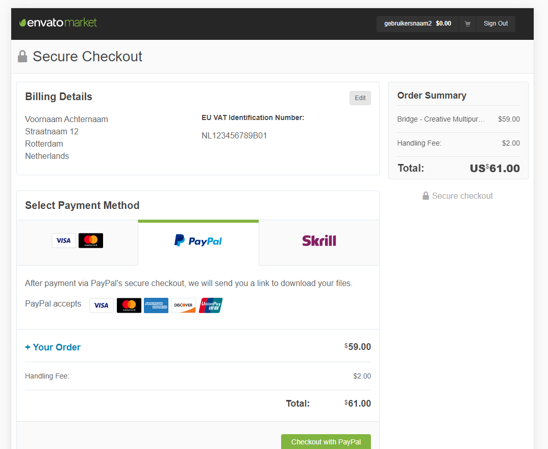 Nadat alles is ingevuld kun je gaan betalen voor de WordPress template. Zoals je hieronder kunt zien, Envato biedt 3 betaalmethoden: Creditcard, Paypal en Skrill. Wij Nederlanders hadden graag nog minimaal één extra betaalmethode gezien: iDeal. Dat is het slechte nieuws, Envato biedt geen iDeal als betaalwijze. Beschik je over een creditcard, een paypal account of zelfs een Skrill account dan is dit geen probleem. Kies dan voor de gewenste payment provider door op het corresponderende tabblad te klikken en de details in te vullen. Bij alle drie methoden moet je helaas wel $2.00 dollar handling fee (afhandeling kosten) betalen. Na het afrekenen krijg je gelijk toegang tot de bestanden die je kunt downloaden (let op: dit kunnen soms grote bestanden zijn van meer dan 100 MB (misschien niet met jouw 4G of 5G abonnement downloaden).
